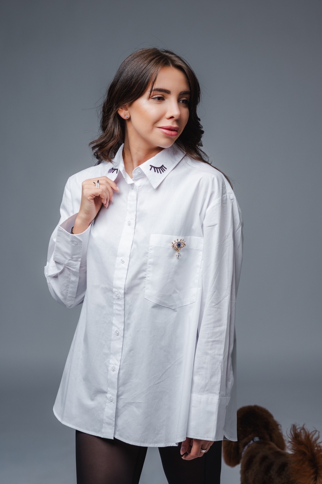 Риза с модерен силует и изразен характер, съчетаваща комфорт и стил. Всеки модел е допълнен с ръчно изработени декоративни детайли, които превръщат дрехата в уникален акцент и подчертават индивидуалността. Перфектен избор за ежедневието, когато аксесоарите и модата се срещат в една завършена визия. Лесна за комбиниране както с небрежни, така и с по-елегантни аутфити.
